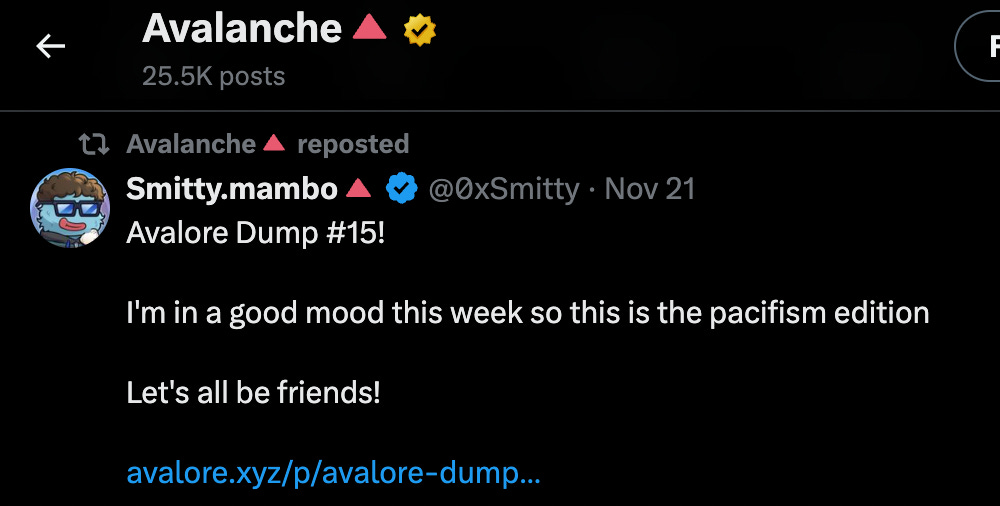 I think this post from Avery was mostly well-intentioned, but it makes a good section header for what I want to talk about! The AVAX account recently posted a banger of a video about handling crypto at Thanksgiving dinner, along with reposting a VERY popular weekly newsletter: