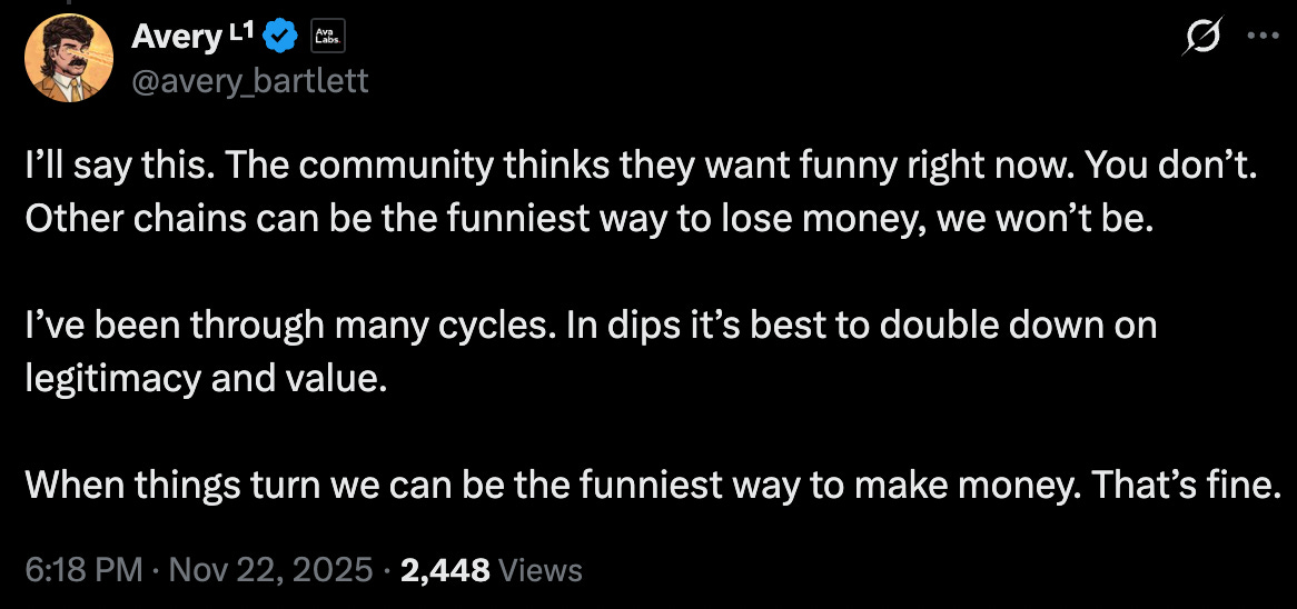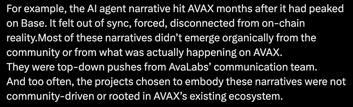 This is representative of a strategy Avalabs has used in the past—copy/pasting things that worked elsewhere and trying to bring sub-par versions here long after the original meta has died (Anime NFTs, InfoFi, AI, Sports, etc etc). I think critiquing this is good, but to be fair it seems like they have learned from past mistakes and aren’t doing it anymore. Progress!