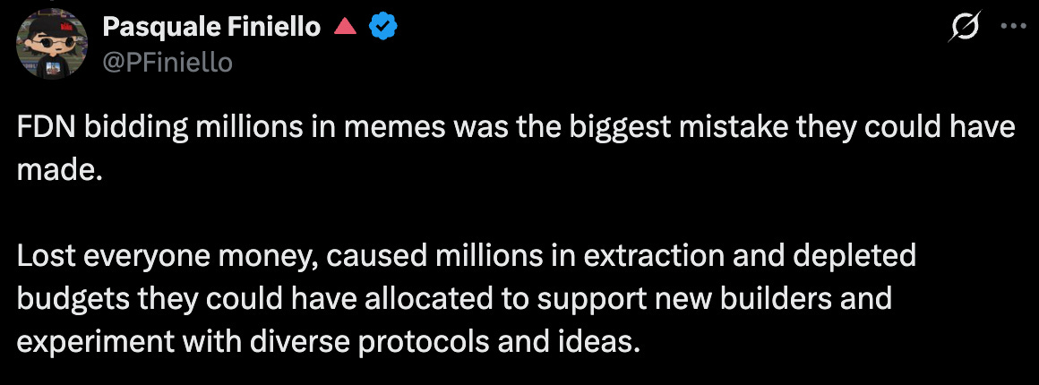 The other good point Paps made was talking about how FDN spent a TON of money on the memecoin presale projects with basically no coordination. I won’t pretend to know the best way to spend money on something, but I suspect that discussing it with the project itself would be a good start.