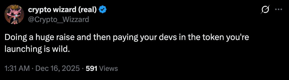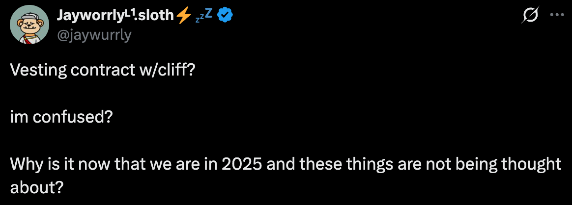 This one is pretty simple—nobody is taking a job for vested tokens. For founders this makes plenty of sense as it’s their project, but you think a website dev is going to attach their pay to the long-term success of someone else’s leadership? In crypto? Locking up the tokens for any amount of time will be a hard no from me, dawg.