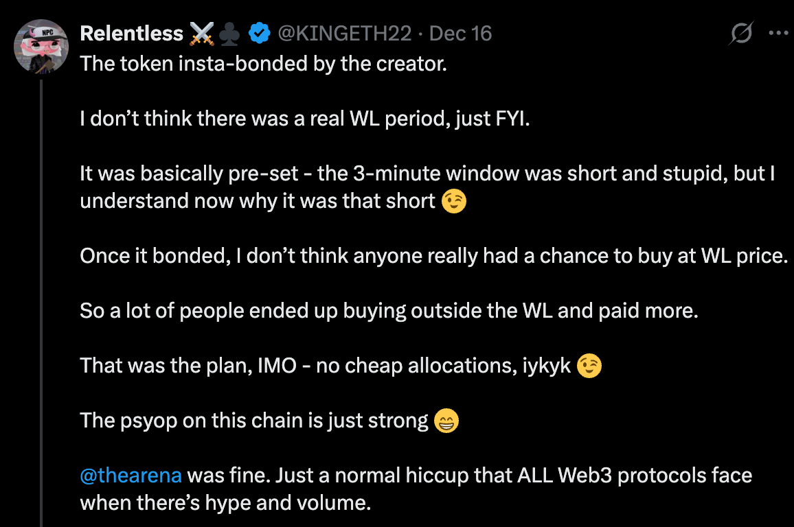 Another thing that needs to be noted is that the default launch mechanics for Arena tokens involve “extending” the whitelist AFTER the token launch. This means that even if you were whitelisted, you might have had issues buying immediately on launch.