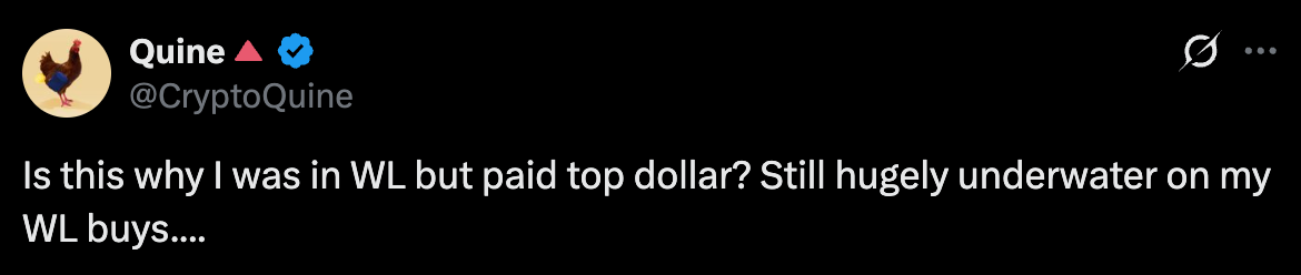 The idea that “nobody had a chance to buy at WL price” is simply incorrect. Also, since the token ended the WL period at such a high market cap, you were likely better off waiting for it to retrace a few minutes later anyway!