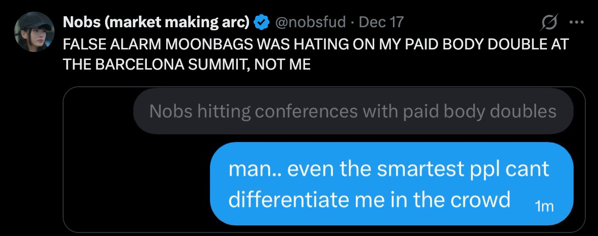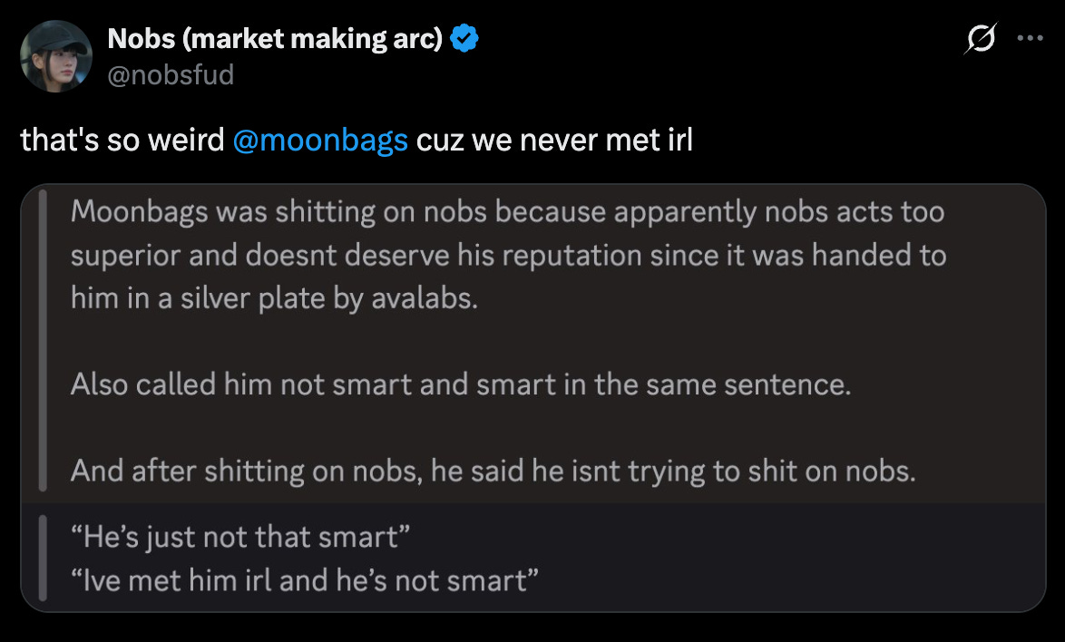 Uh oh! Moonbags got drunk on a space and talked shit about Nobs! Full disclosure: I was not in this space, so this is secondhand. I’m spreading rumors! This is a true smut column now!