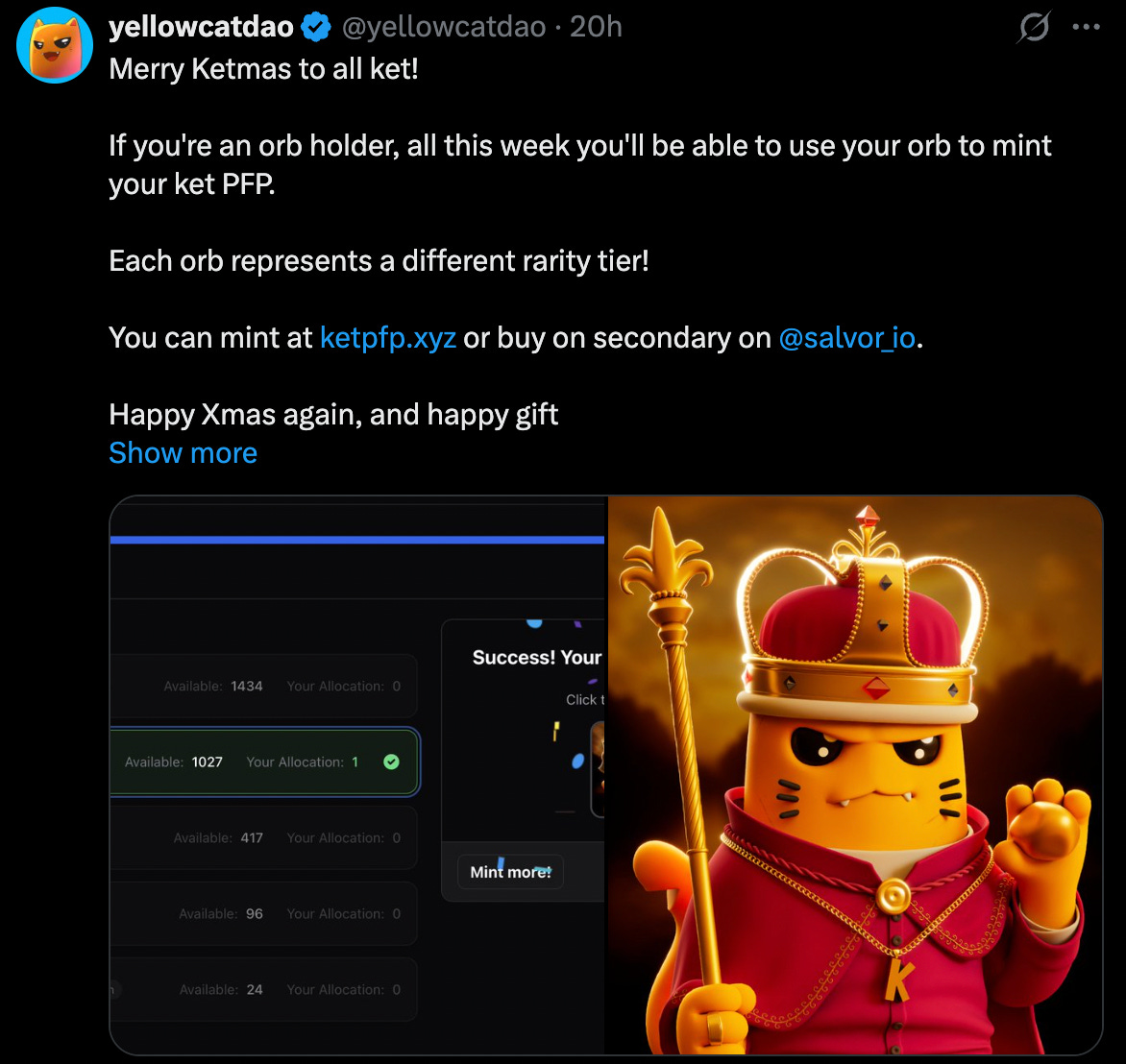 Merry Ketmas! The KET team decided to stealth launch PFPs for orb holders today. I love it when projects do shit like this. Clearly they’re not making money on this and it’s just to give supporters a little gift.