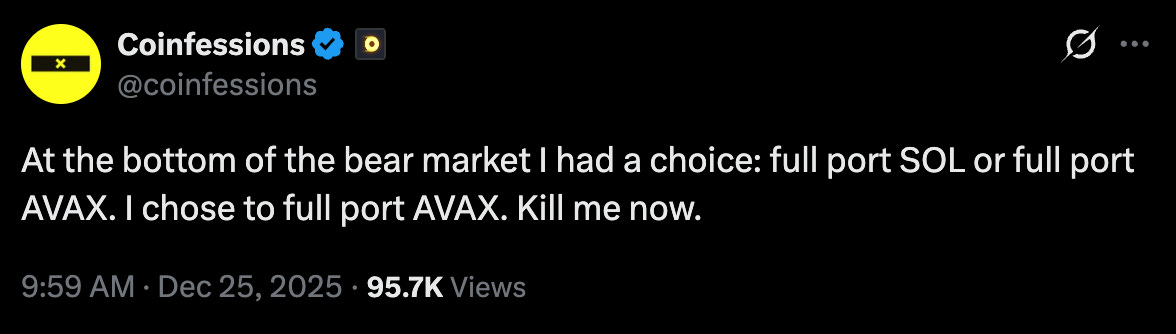 They’ve been better about this lately, but my first resolution is to continue that trend and stop posting LinkedIn slop on the Twitter account. The audience is CT, you don’t need to post these nonsense numbers. Everyone knows they’re BS and is laughing at them. Post them where the institutions are looking! They don’t know! They like numbers!