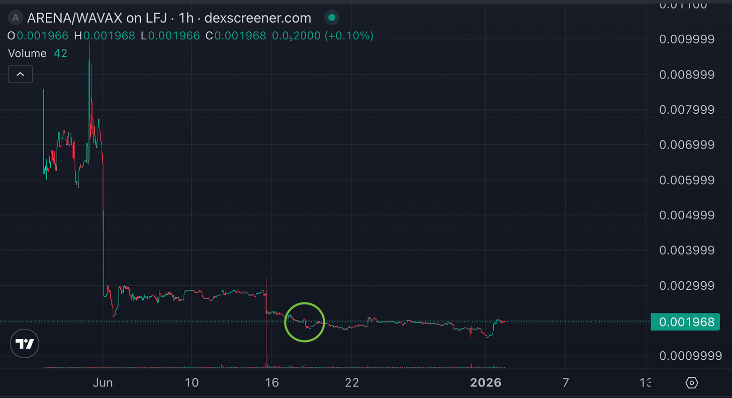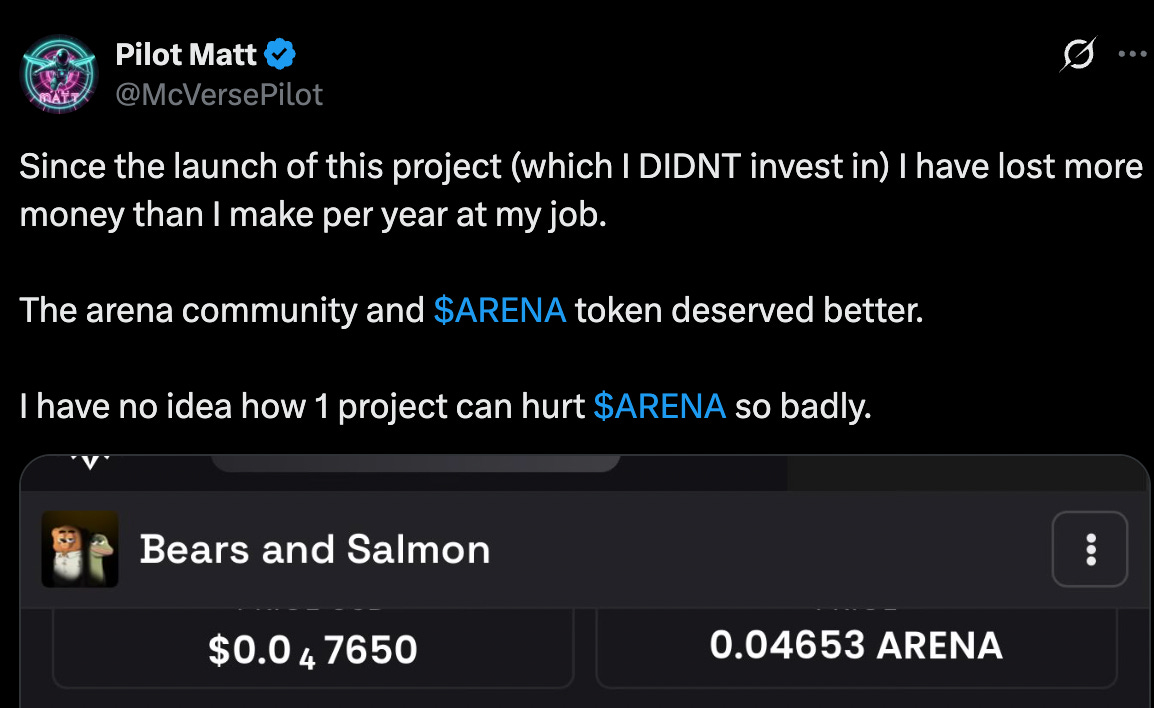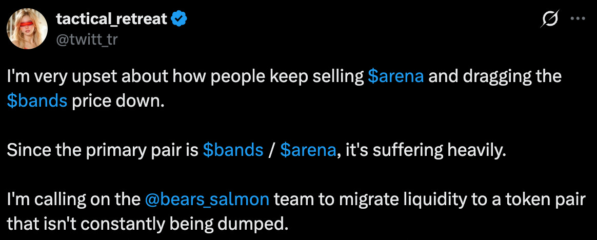 There was $1.5M of liquidity for $ARENA at launch—it has since been decreased substantially. If you think this amount of sell pressure caused a 40% (!) drop in token price, I don’t know what to tell you.