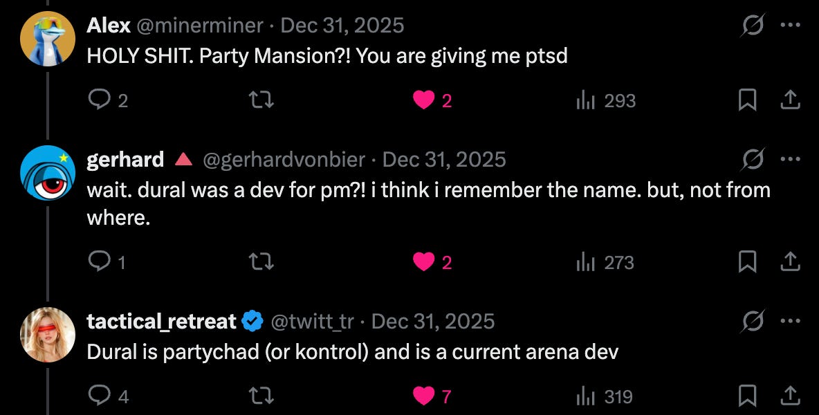 His most exciting find was that one of the lead Arena devs, Dural, has wallets that appear to be linked to the same Binance deposit addresses as the old Party Mansion team! How exciting!