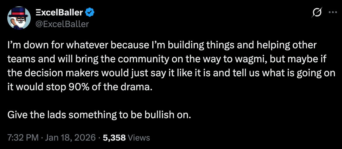 I understand that there are new employees who don’t know all the lore, but the reality is that the community cannot be expected to take everything on good faith, especially in crypto. As Excel said, “Give the lads something to be bullish on.” It feels like we haven’t gotten that in a long time. If you guys take care to shape the narrative towards how things will tangibly benefit the community, people WILL react positively. Just make people feel heard and you will get lots of support.