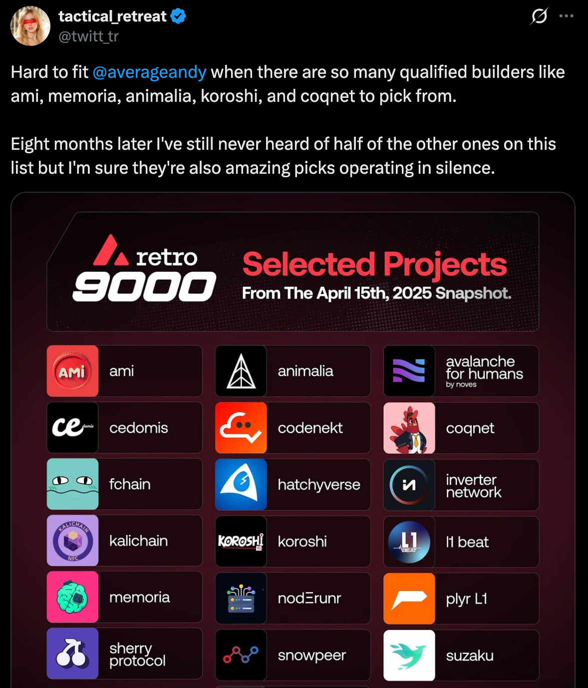 Now I’m not trying to say Andy deserves a grant over these projects just because he’s an AVAX member. Obviously certain things fit the program and certain things don’t.