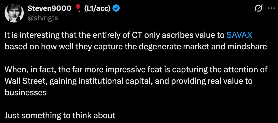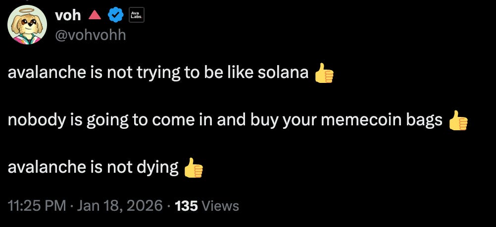 HOWEVER, and this is important, memecoins are not the ONLY thing that will satisfy the community. Avalabs members act like the community is mad because they’re not buying memecoins (true) and that nothing else they do will be able to satisfy the masses (false!!). This is another common theme and will come up again later!