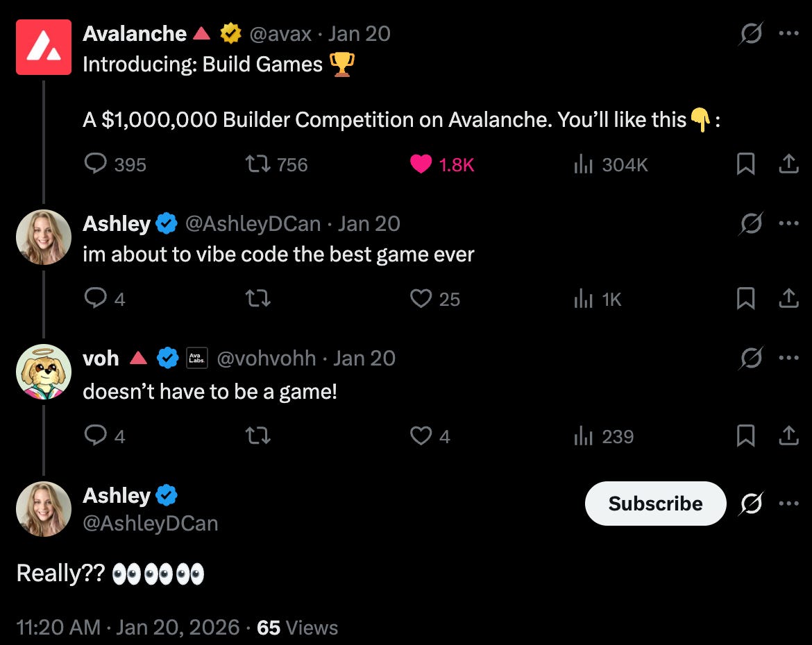 We finally got clarity on what the hyped 1/20 announcement was! AVAX announced “Build Games,” a grant program where the winning projects will receive a share of a $1M prizepool.