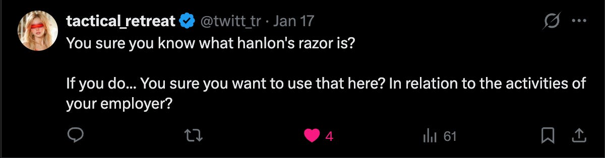I won’t say much here as this horse has been beaten to death. Those of you familiar with Hanlon’s Razor may be wondering if Kevin is trying to insinuate that the FDN is acting out of stupidity, not out of malice. Is that better?