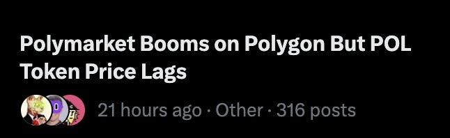 I’ve spoken with numerous people who actually use the Polygon chain (they were hard to find, but they exist) and all of them seemed to echo the same sentiment—the presence of Polymarket is probably great for the KPIs of employees at Polygon Labs (or whatever the company is called) but it does little for the actual ecosystem.