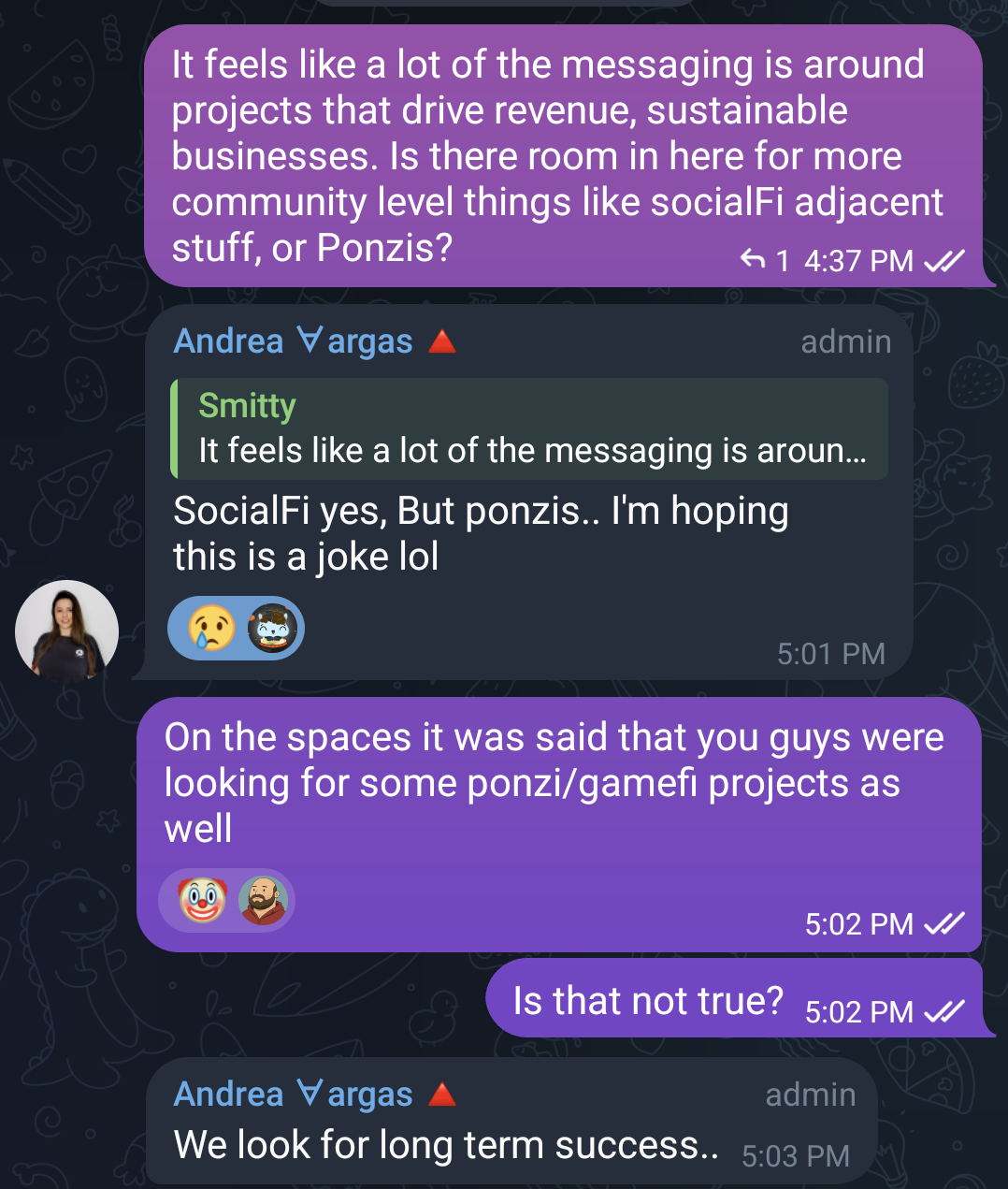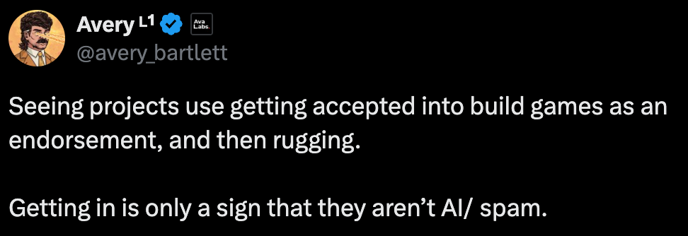 I even posted about this in the Build Games Telegram chat. I was wondering where our fun, ponzi experiments might fit in to this seemingly profit and sustainability focused program. I got the most AvaLabs response possible: