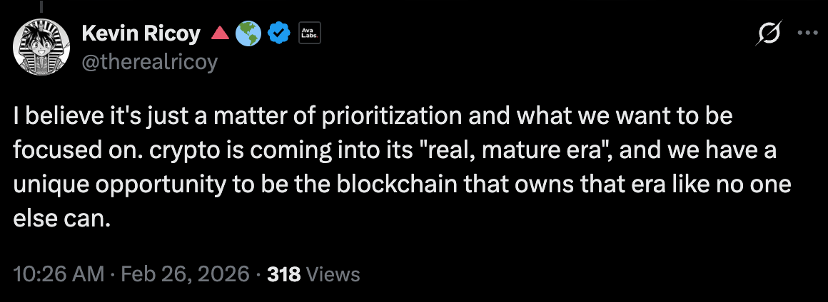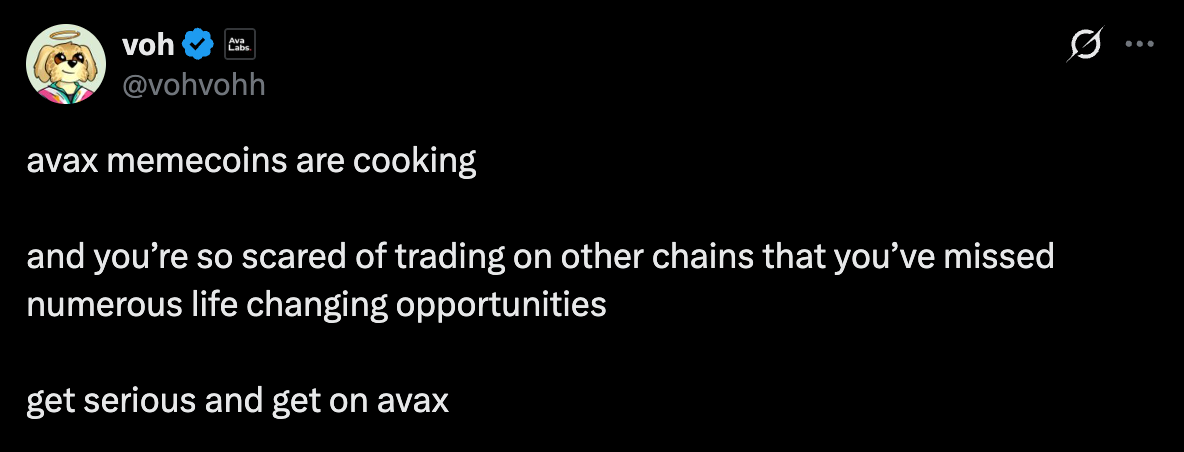 It seems that at the same time, all blockchains have decided that it’s time for crypto to “grow up.” This is not an AVAX specific problem actually, and we’re seeing the same things on Solana, Base, pretty much everywhere. Everyone who made a shitload of money launching a chain in the last 5 years has decided it’s time for them to change the world and “mature.”