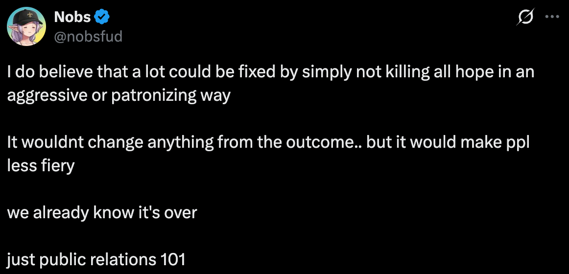 And yes, on all of these chains the community is pissed off. This is doubly frustrating because it’s easy for employees to say “Hey look at that, people on Solana are pissed too! It’s just a global crashout because prices are down!”