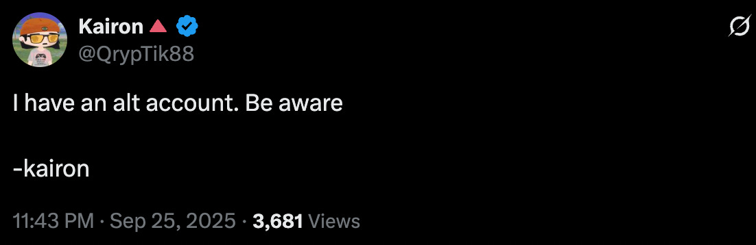 Spicy Rich posted an essay (seriously, it’s long) about how Kairon and Exodus are the same person. As a refresher, Kairon is the one who released and rugged $LUDUS—a topic from the Lore Dump Week 7. Exodus is a reply guy who generically bullposts AVAX and started around the time of the MindoAI campaign (covered in week 6 of the Dump). He was an AVAX Team1 member as well as had some kind of involvement with the Arena team.