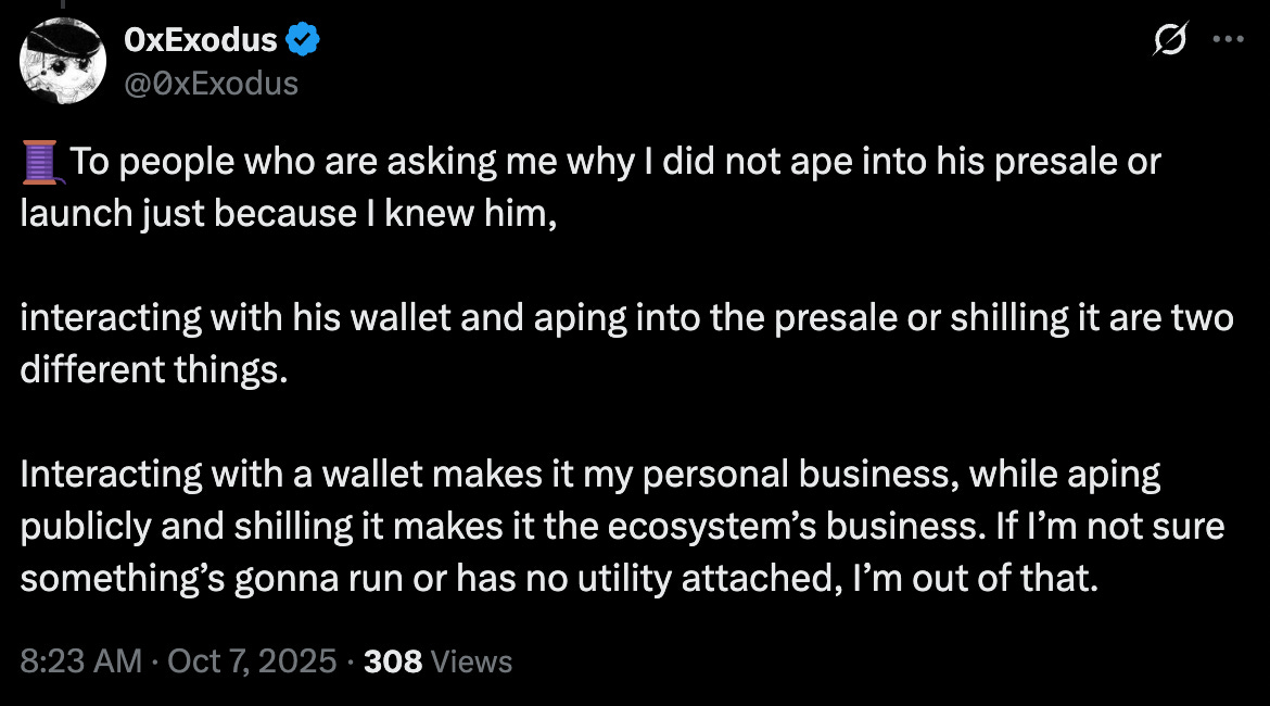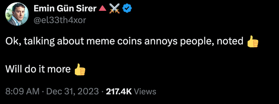 It also doesn’t help that Emin clearly has contempt for the more degen sides of crypto, while that makes up a large part of what the community enjoys. In the meantime we can cope-post a bit as we wait for the pendulum to swing back our way (hopefully).