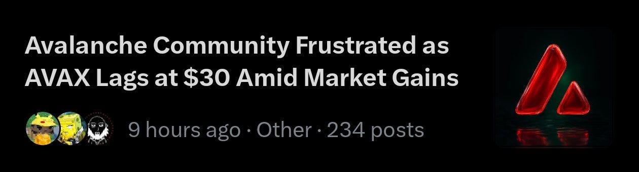 Another great weekly summary of “our AVAX community” experience (clearly, as you pointed out, not in sync with the chain leaders experience).
