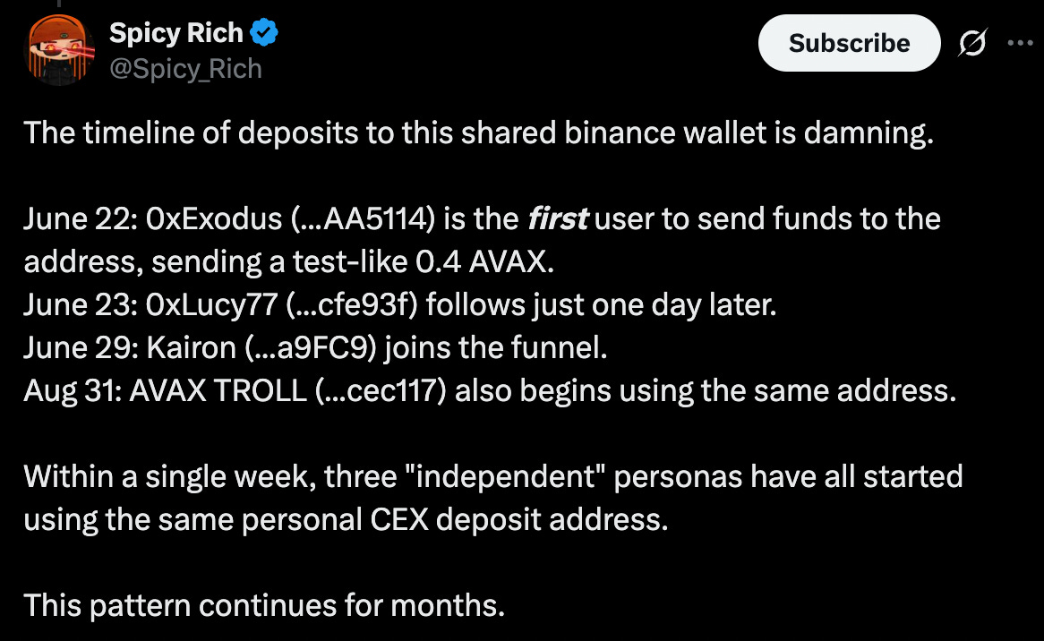The TLDR here is that they both (and some others) were depositing to the same Binance wallet address upwards of 30 times over a span of a few months. Sounds like the same person to me! Rich went on to post about how they have similar “social footprints” which is a bit more dubious, but sharing a deposit address is a pretty big red flag.