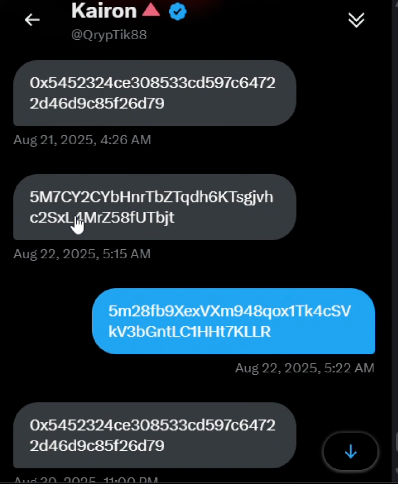 He said something like “I don’t have TG on my phone so he sent me wallet addresses on Twitter” which is a fine excuse I guess. This looks exactly like my Discord chat history with myself as I pass notes between devices. Interesting!