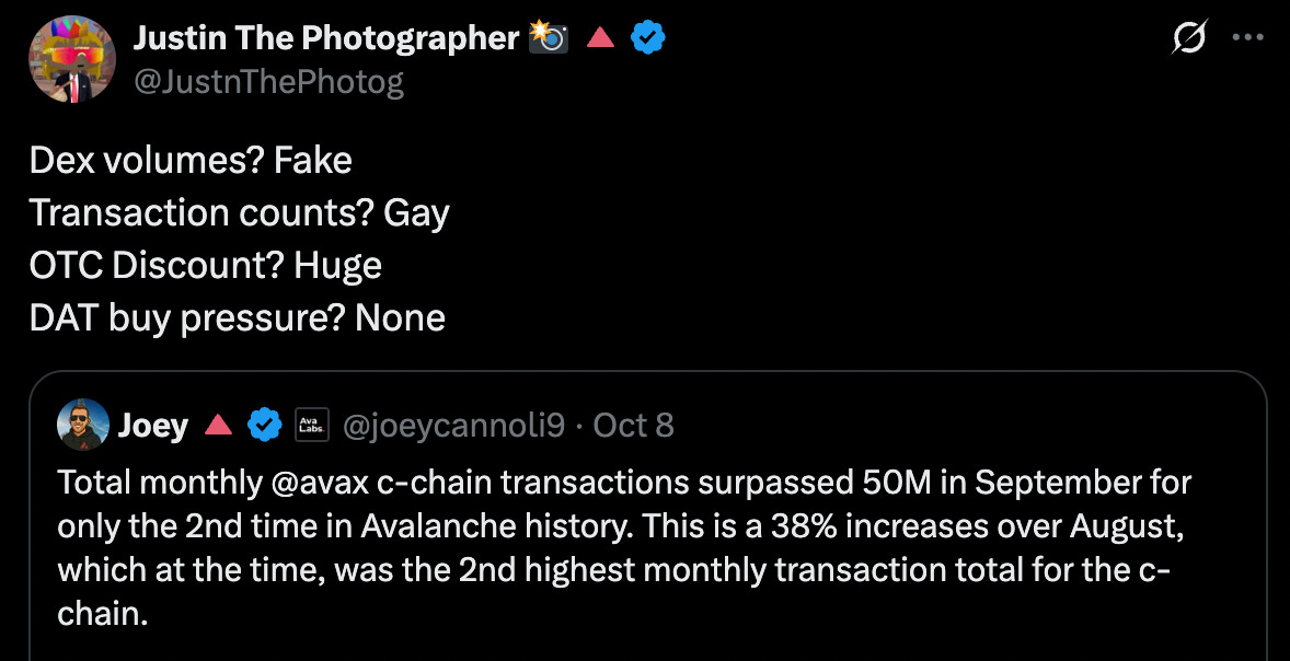 From a community perspective, what they see are DATs purchasing off-market tokens at 60-70% discounts and 17.42B in wash trading volume. Naturally this will start to piss people off, especially as other ecosystems seem to be more in-tune with their users on twitter. Community members are beginning to feel like the chain is just not made for them and are starting to look elsewhere which is quite sad.